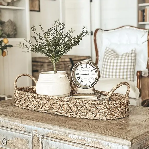 The trick is choosing a tray, basket, or caddy that’s stylish enough to live on your table 24/7. Figure what size would work good for your table. Here are some of our favorites: