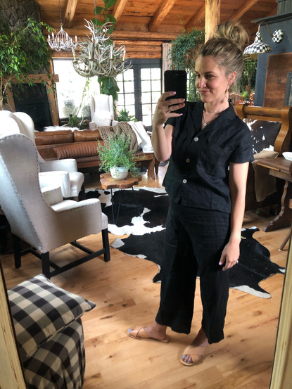 The black linen out fit above is a simple standout. The shoe choice definitely changes it up from a dressier wedge to a simple, camel slip on.